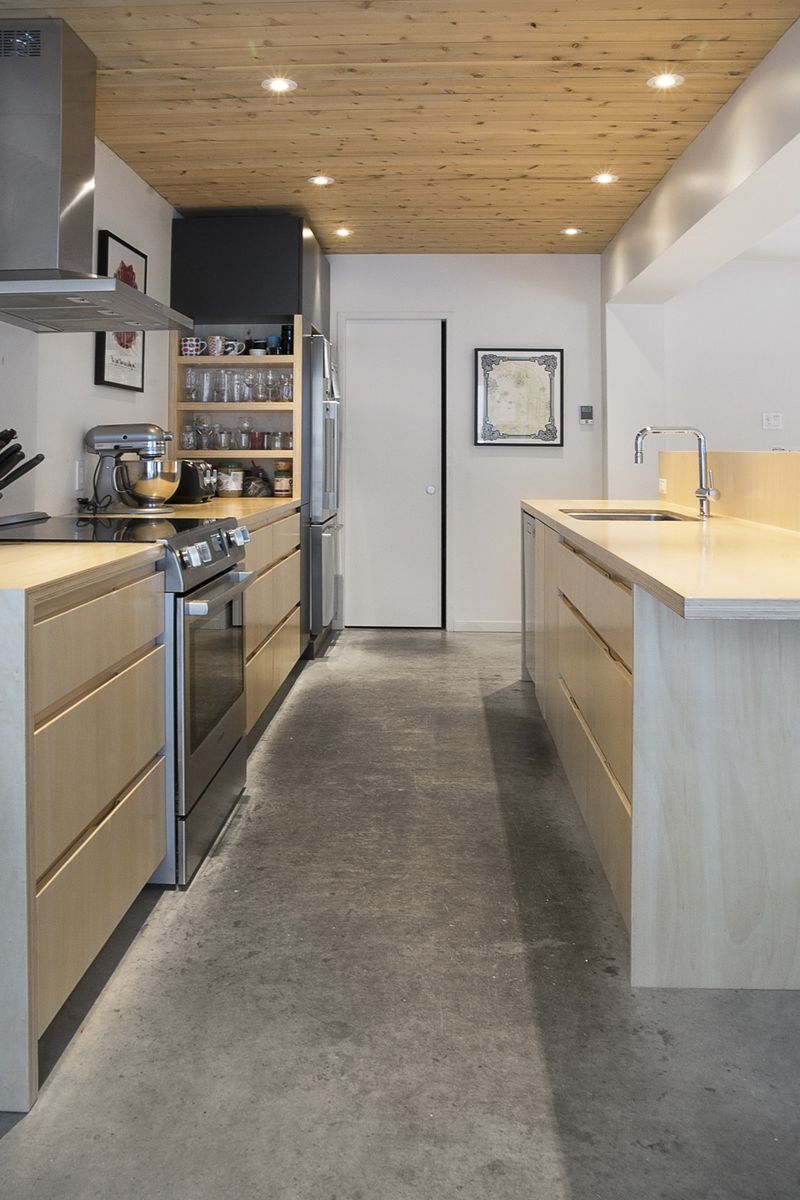 Les deux enfants de la famille grandissant, la petite maison de type ‘’vétéran’’ est devenue bien étriquée. Ses pièces de vie cloisonnées et sombres répondent mal aux besoins de ses occupants. Deux options se posent: déménager, ou agrandir. Les maisons possédant trois chambres sont chères dans le secteur, et souvent fort mal rénovées. Le quartier est agréable, les voisins sympathiques. La famille décide donc de se lancer dans le projet de rénovation et d’agrandissement de la propriété. La maison est rafraîchie, décloisonnée, et agrandie pour répondre aux usages nécessaires: ajout d’une chambre et d’une petite salle de bain pour les parents, vestibule plus généreux, création d’un petit bureau, et d’une cuisine fonctionnelle. Le choix se porte sur l’insertion d’un volume de 500 pieds carrés dans la bande étroite située entre la maison et le voisin, d’à peine 9 pieds de large. Sans aucun usage attribué, cet espace résiduel permet d’agrandir le rez-de-chaussée en empiétant très peu sur la cour arrière. La cuisine intègre donc cet espace tout en longueur, et s’ouvre largement sur la rue, sur le salon et la salle à manger. Une fois les anciennes cloisons enlevées, la lumière se diffuse par les quatre faces de la maison. A l’arrière, la suite des parents profite de la vue et du calme verdoyant de la grande cour ensoleillée. Le parement extérieur de l’agrandissement, ainsi que les bacs à fleurs qui ceinturent la terrasse aménagée en arrière sont en bois brûlé, ce qui permet de protéger le bois contre les UV, les intempéries et les insectes, et augmente donc considérablement sa durée de vie. Le nouveau volume long et bas en bois noir se marie tout en douceur avec la forme classique et la brique rouge de la maison d’origine.