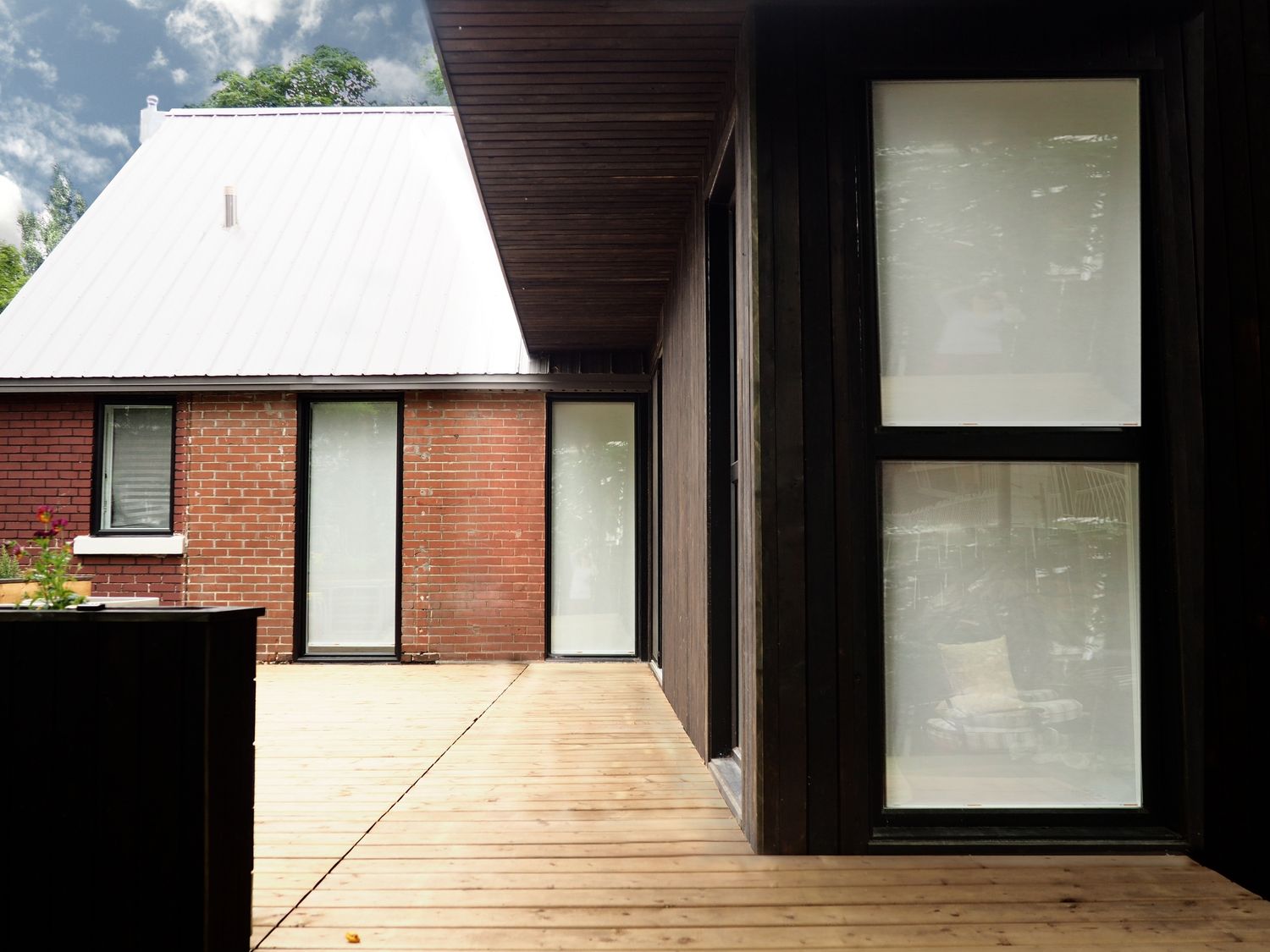 Les deux enfants de la famille grandissant, la petite maison de type ‘’vétéran’’ est devenue bien étriquée. Ses pièces de vie cloisonnées et sombres répondent mal aux besoins de ses occupants. Deux options se posent: déménager, ou agrandir. Les maisons possédant trois chambres sont chères dans le secteur, et souvent fort mal rénovées. Le quartier est agréable, les voisins sympathiques. La famille décide donc de se lancer dans le projet de rénovation et d’agrandissement de la propriété. La maison est rafraîchie, décloisonnée, et agrandie pour répondre aux usages nécessaires: ajout d’une chambre et d’une petite salle de bain pour les parents, vestibule plus généreux, création d’un petit bureau, et d’une cuisine fonctionnelle. Le choix se porte sur l’insertion d’un volume de 500 pieds carrés dans la bande étroite située entre la maison et le voisin, d’à peine 9 pieds de large. Sans aucun usage attribué, cet espace résiduel permet d’agrandir le rez-de-chaussée en empiétant très peu sur la cour arrière. La cuisine intègre donc cet espace tout en longueur, et s’ouvre largement sur la rue, sur le salon et la salle à manger. Une fois les anciennes cloisons enlevées, la lumière se diffuse par les quatre faces de la maison. A l’arrière, la suite des parents profite de la vue et du calme verdoyant de la grande cour ensoleillée. Le parement extérieur de l’agrandissement, ainsi que les bacs à fleurs qui ceinturent la terrasse aménagée en arrière sont en bois brûlé, ce qui permet de protéger le bois contre les UV, les intempéries et les insectes, et augmente donc considérablement sa durée de vie. Le nouveau volume long et bas en bois noir se marie tout en douceur avec la forme classique et la brique rouge de la maison d’origine.