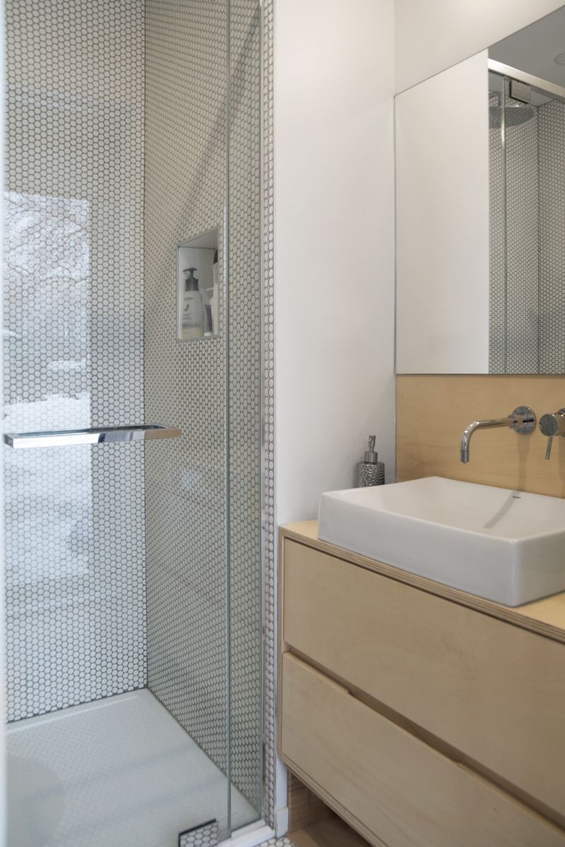 Les deux enfants de la famille grandissant, la petite maison de type ‘’vétéran’’ est devenue bien étriquée. Ses pièces de vie cloisonnées et sombres répondent mal aux besoins de ses occupants. Deux options se posent: déménager, ou agrandir. Les maisons possédant trois chambres sont chères dans le secteur, et souvent fort mal rénovées. Le quartier est agréable, les voisins sympathiques. La famille décide donc de se lancer dans le projet de rénovation et d’agrandissement de la propriété. La maison est rafraîchie, décloisonnée, et agrandie pour répondre aux usages nécessaires: ajout d’une chambre et d’une petite salle de bain pour les parents, vestibule plus généreux, création d’un petit bureau, et d’une cuisine fonctionnelle. Le choix se porte sur l’insertion d’un volume de 500 pieds carrés dans la bande étroite située entre la maison et le voisin, d’à peine 9 pieds de large. Sans aucun usage attribué, cet espace résiduel permet d’agrandir le rez-de-chaussée en empiétant très peu sur la cour arrière. La cuisine intègre donc cet espace tout en longueur, et s’ouvre largement sur la rue, sur le salon et la salle à manger. Une fois les anciennes cloisons enlevées, la lumière se diffuse par les quatre faces de la maison. A l’arrière, la suite des parents profite de la vue et du calme verdoyant de la grande cour ensoleillée. Le parement extérieur de l’agrandissement, ainsi que les bacs à fleurs qui ceinturent la terrasse aménagée en arrière sont en bois brûlé, ce qui permet de protéger le bois contre les UV, les intempéries et les insectes, et augmente donc considérablement sa durée de vie. Le nouveau volume long et bas en bois noir se marie tout en douceur avec la forme classique et la brique rouge de la maison d’origine.