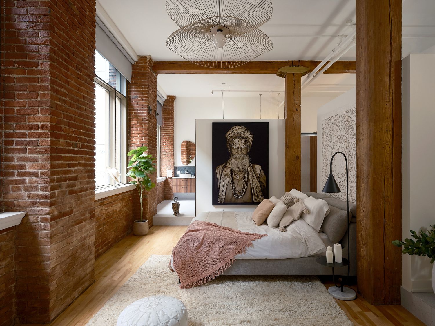 Le concept a donc été de cloisonner partiellement la suite des maîtres pour y intégrer des zones dédiées pour le sommeil, le walk-in et celle humide, construire un sauna dans la suite des maîtres pour profiter facilement de séances récupératrices, créer une ambiance de détente avec un bain autoportant, installer un plancher chauffant dans la suite des maîtres pour un confort absolu, aménager une salle d’entraînement personnelle pour des séances de yoga à porter de main, rendre un espace restreint utile en y aménageant un cellier sur mesure, placer une cloison de verre coulissante à titre de séparation modulable et lumineuse pour une chambres des invités, instaurer un climat de voyage avec une niche, une vasque et des accessoires à tendance orientale et intégrer les murs et les colonnes existants en brique au décor pour mettre en valeur le patrimoine historique du bâtiment.