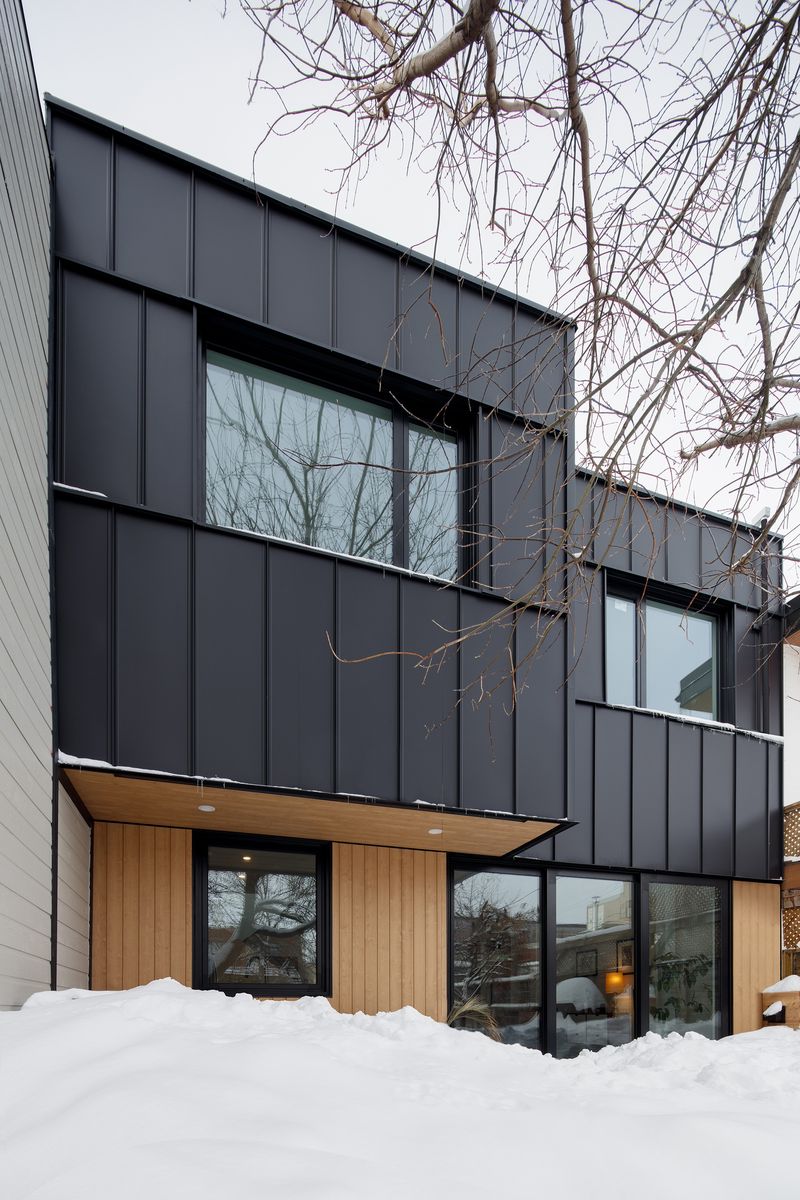 L’intervention sur la maison existante s’est fait avec un esprit de valorisation de cette typologie particulière à Montréal. Des travaux de restauration de la façade ont permis de retirer la fausse-mansarde, un élément non originel de la façade, et d’y construire un nouveau couronnement plus approprié pour cette typologie. En profitant de la généreuse hauteur de la maison, le plancher du rez-de-chaussée a été surélevé partiellement afin d’augmenter la hauteur libre au sous-sol. L’avant de la maison, où se trouve le vestibule d’entrée et un bureau, reste au niveau du rez-de-chaussée existant.