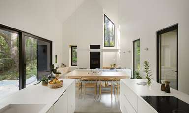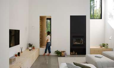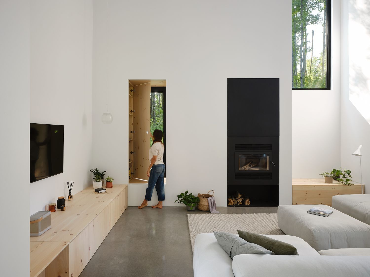 Inspiré des maisons longues autochtones à la Tissaraouata, le chalet a été conçu pour servir à la fois de retraite pour les clients et de point de rassemblement collectif, capable d’accueillir leurs enfants et leurs futurs petits-enfants, tout en minimisant l’empreinte au sol. Pour atteindre cet objectif ambitieux le projet a nécessité une réflexion sérieuse sur le volume d’espace clos réellement requis répondant aux besoins des occupants. Un sous-sol pouvant accueillir confortablement jusqu’à douze personnes, a été créé et son plan optimisé grâce à une conception architecturale flexible et polyvalente, permettant l’aménagement des niveaux supérieurs sans compromettre l’harmonie avec l’environnement sensible. La superficie modeste de l’espace principal de vie a été astucieusement compensée par une disposition en aire ouverte et une double hauteur, conférant à la fois des qualités unificatrices et esthétiques qui dissolvent les limites visuelles. Le mobilier intérieur fabriqué sur mesure a été réinterprété pour incarner les principes d’une vie minimaliste.