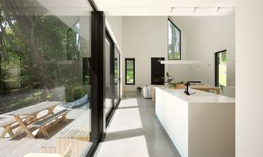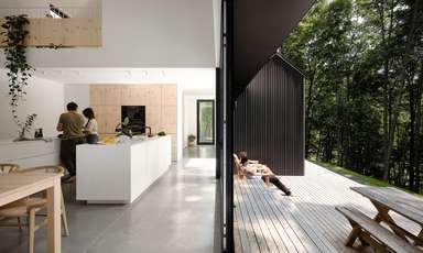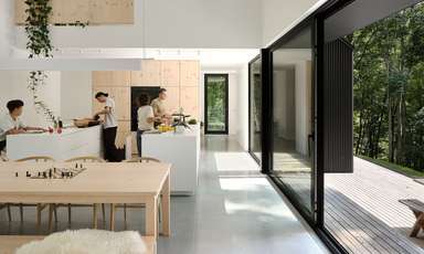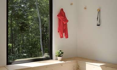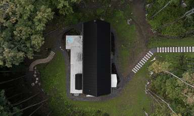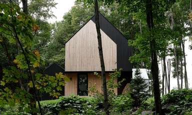 Symbole de rassemblement, des lamelles de bois en cèdre naturel et d’autres teintées en noir enveloppent avec élégance les façades extérieures de la bâtisse principale et créent l’impression d’un entrelacs de plusieurs maisons, à la silhouette simple : une structure rectangulaire surmontée d’un toit en pente. Cet effet est accentué par des cabanes latérales attenantes, fidèles répliques de la construction principale. Le thème qui puise son inspiration dans la notion élémentaire d’un chez-soi nordique, devient ainsi un motif récurrent.