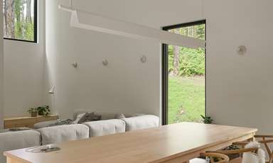 De larges ouvertures, parsèment le bâtiment de façon stratégique, établissant une transition sans couture entre l’intérieur et l’extérieur. Cette configuration permet à une douce et uniforme lumière naturelle de baigner le volume habitable, tout en offrant une connexion visuelle directe avec la majesté des montagnes imposantes de Shefford, que l’on soit immobile ou en mouvement vers d’autres zones.