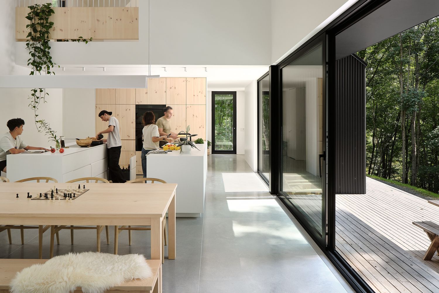 Inspiré des maisons longues autochtones à la Tissaraouata, le chalet a été conçu pour servir à la fois de retraite pour les clients et de point de rassemblement collectif, capable d’accueillir leurs enfants et leurs futurs petits-enfants, tout en minimisant l’empreinte au sol. Pour atteindre cet objectif ambitieux le projet a nécessité une réflexion sérieuse sur le volume d’espace clos réellement requis répondant aux besoins des occupants. Un sous-sol pouvant accueillir confortablement jusqu’à douze personnes, a été créé et son plan optimisé grâce à une conception architecturale flexible et polyvalente, permettant l’aménagement des niveaux supérieurs sans compromettre l’harmonie avec l’environnement sensible. La superficie modeste de l’espace principal de vie a été astucieusement compensée par une disposition en aire ouverte et une double hauteur, conférant à la fois des qualités unificatrices et esthétiques qui dissolvent les limites visuelles. Le mobilier intérieur fabriqué sur mesure a été réinterprété pour incarner les principes d’une vie minimaliste.