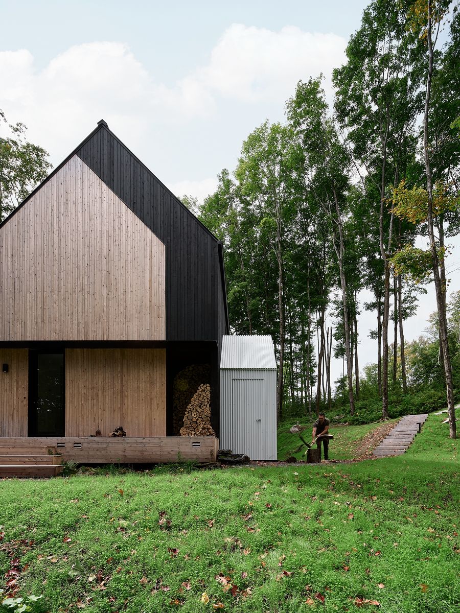 Symbole de rassemblement, des lamelles de bois en cèdre naturel et d’autres teintées en noir enveloppent avec élégance les façades extérieures de la bâtisse principale et créent l’impression d’un entrelacs de plusieurs maisons, à la silhouette simple : une structure rectangulaire surmontée d’un toit en pente. Cet effet est accentué par des cabanes latérales attenantes, fidèles répliques de la construction principale. Le thème qui puise son inspiration dans la notion élémentaire d’un chez-soi nordique, devient ainsi un motif récurrent.