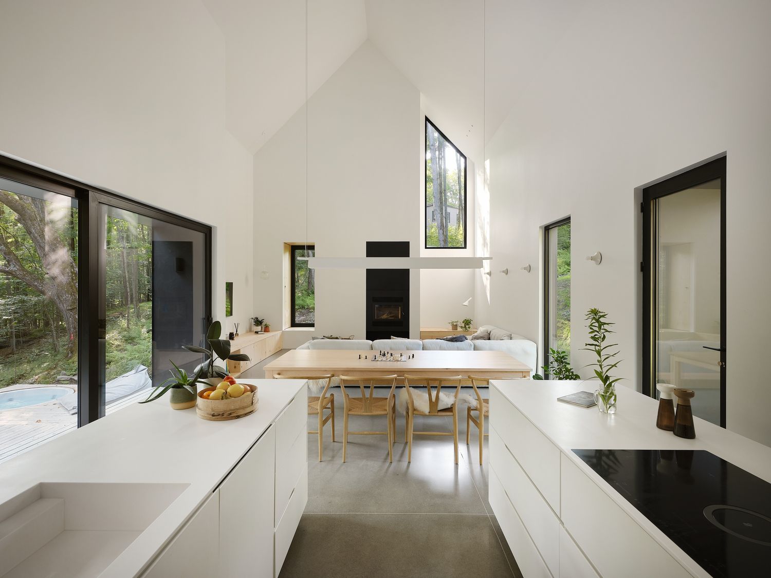 De larges ouvertures, parsèment le bâtiment de façon stratégique, établissant une transition sans couture entre l’intérieur et l’extérieur. Cette configuration permet à une douce et uniforme lumière naturelle de baigner le volume habitable, tout en offrant une connexion visuelle directe avec la majesté des montagnes imposantes de Shefford, que l’on soit immobile ou en mouvement vers d’autres zones.