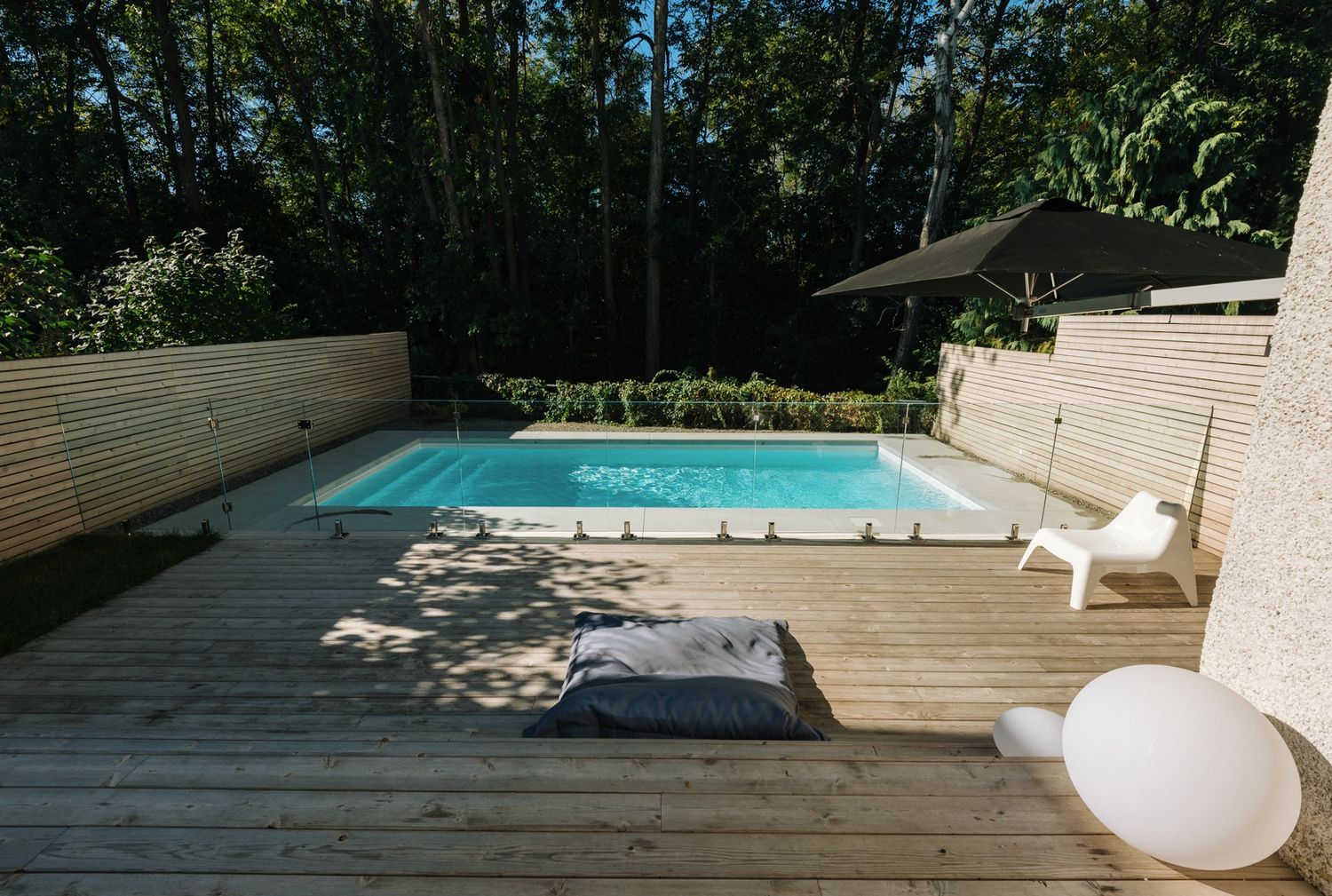 La piscine orientée plein sud, est ceinturée par une cour en cèdre canadien, choisi pour ses vertus durables, imputrescibles et de sa résistance aux intempéries.