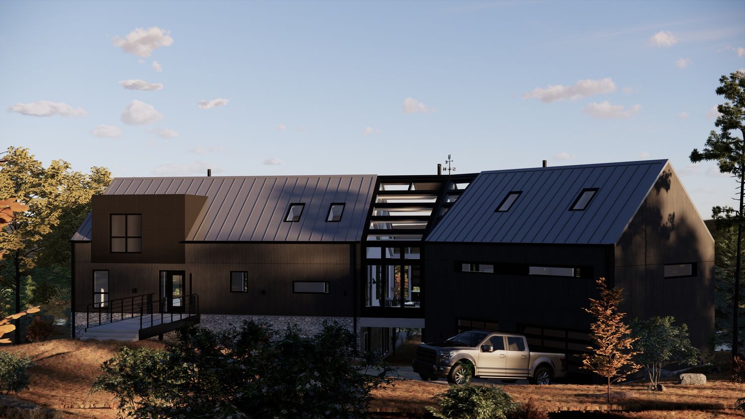 Une réalisation sur mesure pour une maison bi-générationnelle vue sur le lac, bioclimatique, auto-construite en 3 phases : Un double garage avec son loft à l'étage, la maison principale en rez-de-jardin et une serre/jardin d'hiver reliant les deux édifices.