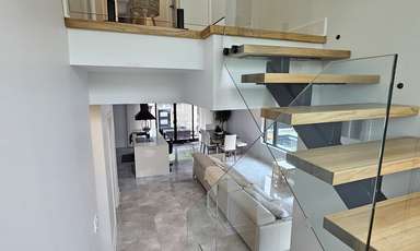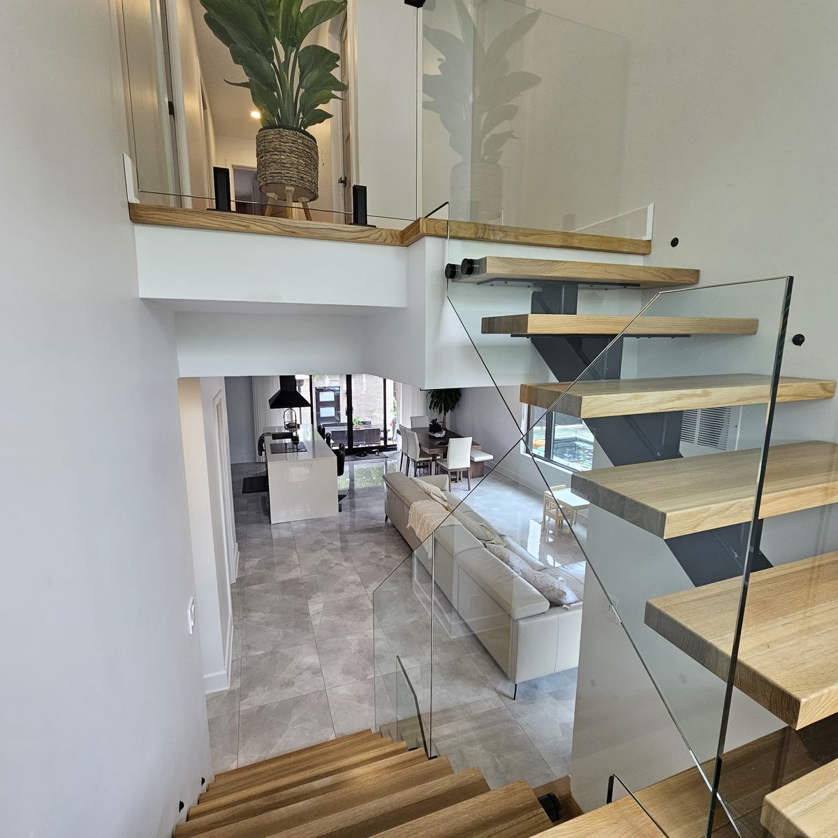 Jolie conception sur mesure d'un garde-corps en verre trempé 12 mm sur 3 étages. Recherches associées Escaliers Granby/Bromont/Cowansville (Estrie) Verre Rampe Garde-corps Escalier