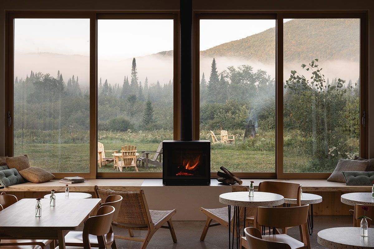 Adossé au Parc national du Mont-Tremblant et situé au creux de la vallée de la rivière du Diable, le projet agrotouristique Farouche propose un concept singulier et unique pour les Laurentides. Exploitant les qualités naturelles et sauvages du territoire de presque cent acres, le projet combine une ferme nordique, un café-buvette, des microrefuges quatre saisons et une base de plein-air. Du côté nord du chemin du Lac-Supérieur, se dresse la grange servant de quartier général aux activités de la ferme. Le parcours qui mène à la petite ferme maraîchère biologique dessert également les serres tunnels, les champs de fleurs et les terres en jachère. C’est au détour de ce bâtiment agricole que débutent les sentiers de randonnées permettant aux visiteurs du site Farouche d’explorer les montagnes de la vallée de La Diable. Côté rivière, au sud du chemin, le café-buvette est au cœur des activités proposées sur le site. Premier bâtiment que l’on aperçoit lors de notre arrivée, on y entre par le marché, qui propose aux visiteurs les produits de saison de la ferme maraîchère et ceux d’autres producteurs de la région, tels que fromages, bières et vins locaux. Au centre du bâtiment, l’espace café et sa cuisine de transformation offrent aussi aux visiteurs de passage et aux occupants des refuges la possibilité de déguster sur place les produits apprêtés de la ferme. La salle à manger s’avance vers la rivière, et ses grandes portes-fenêtres orientées vers l’ouest offrent des vues prenantes sur les couchers de soleil et sur le Mont-Tremblant. Le poêle à bois invite à s’arrêter pour observer la silhouette changeante de la nature, et à se réunir. Niché dans le toit cathédral, un espace mezzanine propose quant à lui un salon tranquille, en retrait. La matérialité est sobre ; les toitures d’acier couleur charbon et le revêtement de pruche naturel rappellent les bâtiments agricoles vernaculaire. Au sud du bâtiment principal se dresse le campement de refuges recouverts de bardeaux de cèdre. Organisés de façon organique et desservis par un sentier sinueux, les quatre petits bâtiments de type A-frame proposent dans un seul espace ouvert un grand lit, une banquette de lecture et un petit poêle au gaz. Par leur minimalisme, les refuges laissent la plus grande place au paysage qui s’ouvre devant soi et à la beauté de la rivière du Diable. Le projet Farouche a été documenté par le photographe Raphaël Thibodeau sur une période de vingt-quatre heures afin de capturer l’évolution du site du lever du soleil sur la rivière jusqu’à l’observation nocturne des refuges illuminés par la lumière de la lune.