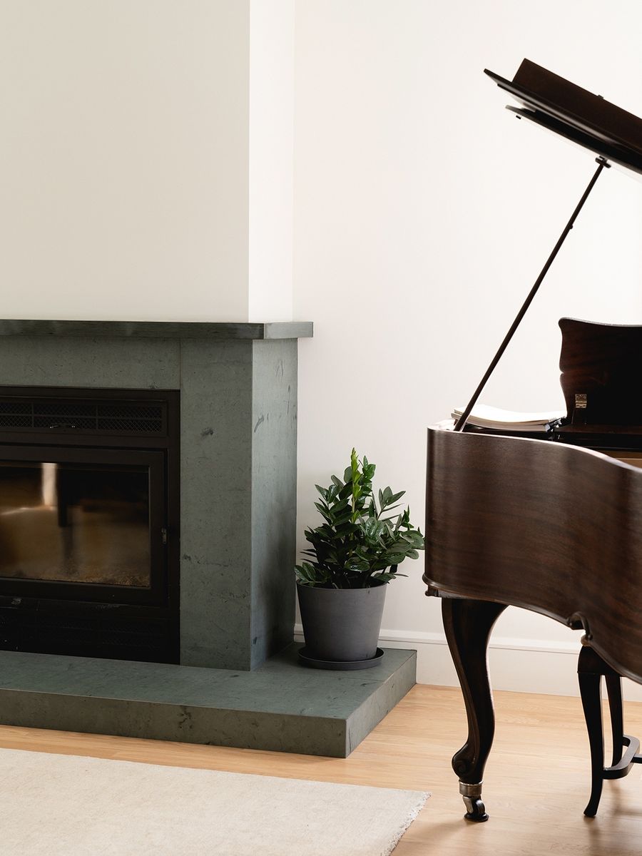 À l'entrée, une nouvelle zone est délimitée par un meuble en chêne blanc fabriqué sur mesure et surmonté d'une vitre en verre fluté. Dans le salon, le nouveau foyer est recouvert de tuiles d'ardoise vertes du Vermont. Du côté de la salle à manger, une nouvelle ouverture en arche dissimule du rangement supplémentaire et facilite l'accès à la cuisine. Une nouvelle saillie vitrée est construite dans la cuisine pour aménager un banc lumineux. Les caissons de cuisine shaker sont un clin d'oeil aux origines de la maison, alors que les caissons de chêne apportent une touche plus contemporaine.