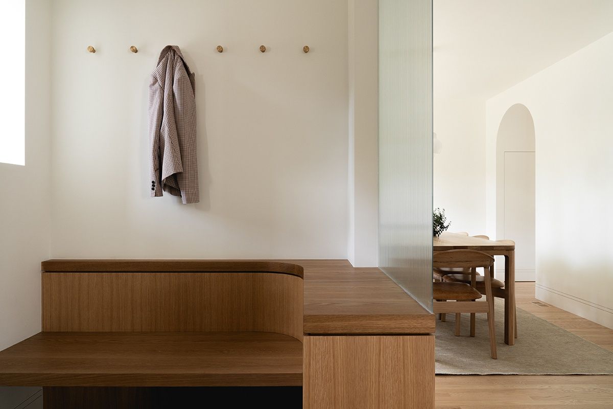 À l'entrée, une nouvelle zone est délimitée par un meuble en chêne blanc fabriqué sur mesure et surmonté d'une vitre en verre fluté. Dans le salon, le nouveau foyer est recouvert de tuiles d'ardoise vertes du Vermont. Du côté de la salle à manger, une nouvelle ouverture en arche dissimule du rangement supplémentaire et facilite l'accès à la cuisine. Une nouvelle saillie vitrée est construite dans la cuisine pour aménager un banc lumineux. Les caissons de cuisine shaker sont un clin d'oeil aux origines de la maison, alors que les caissons de chêne apportent une touche plus contemporaine.