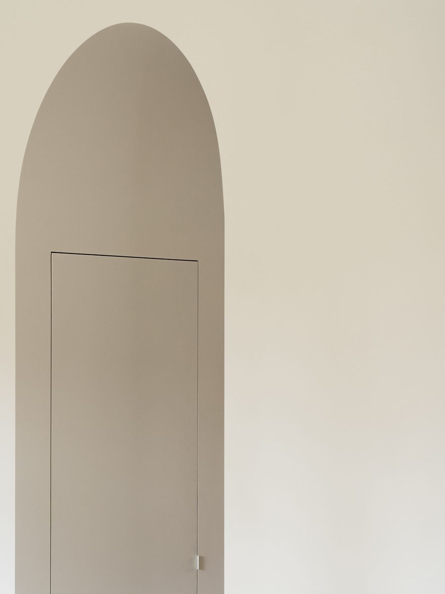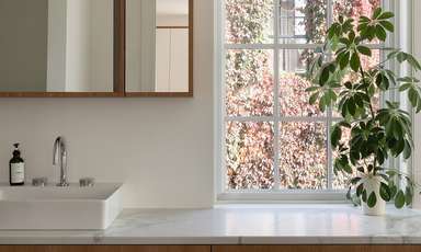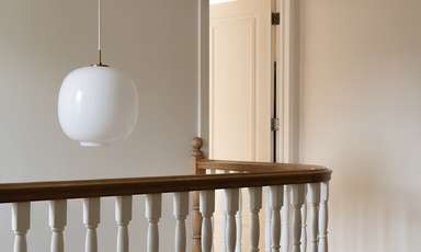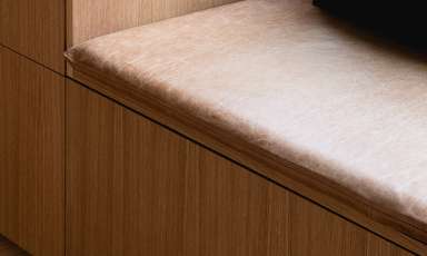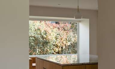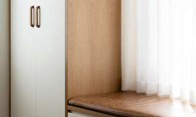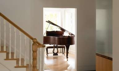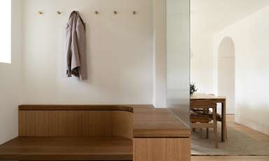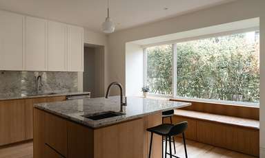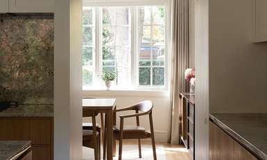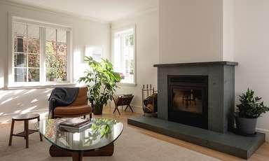 À l'entrée, une nouvelle zone est délimitée par un meuble en chêne blanc fabriqué sur mesure et surmonté d'une vitre en verre fluté. Dans le salon, le nouveau foyer est recouvert de tuiles d'ardoise vertes du Vermont. Du côté de la salle à manger, une nouvelle ouverture en arche dissimule du rangement supplémentaire et facilite l'accès à la cuisine. Une nouvelle saillie vitrée est construite dans la cuisine pour aménager un banc lumineux. Les caissons de cuisine shaker sont un clin d'oeil aux origines de la maison, alors que les caissons de chêne apportent une touche plus contemporaine.
