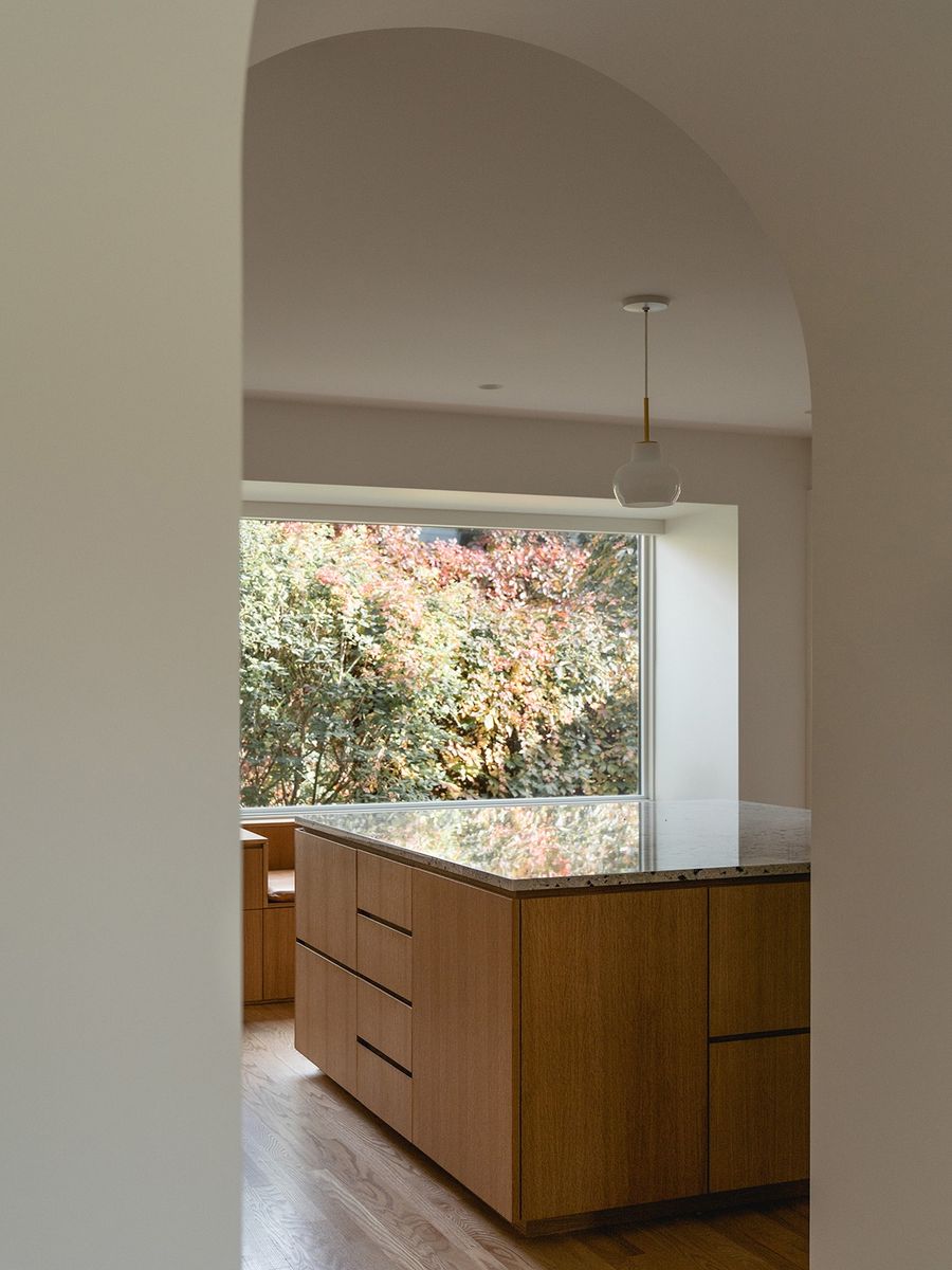 À l'entrée, une nouvelle zone est délimitée par un meuble en chêne blanc fabriqué sur mesure et surmonté d'une vitre en verre fluté. Dans le salon, le nouveau foyer est recouvert de tuiles d'ardoise vertes du Vermont. Du côté de la salle à manger, une nouvelle ouverture en arche dissimule du rangement supplémentaire et facilite l'accès à la cuisine. Une nouvelle saillie vitrée est construite dans la cuisine pour aménager un banc lumineux. Les caissons de cuisine shaker sont un clin d'oeil aux origines de la maison, alors que les caissons de chêne apportent une touche plus contemporaine.