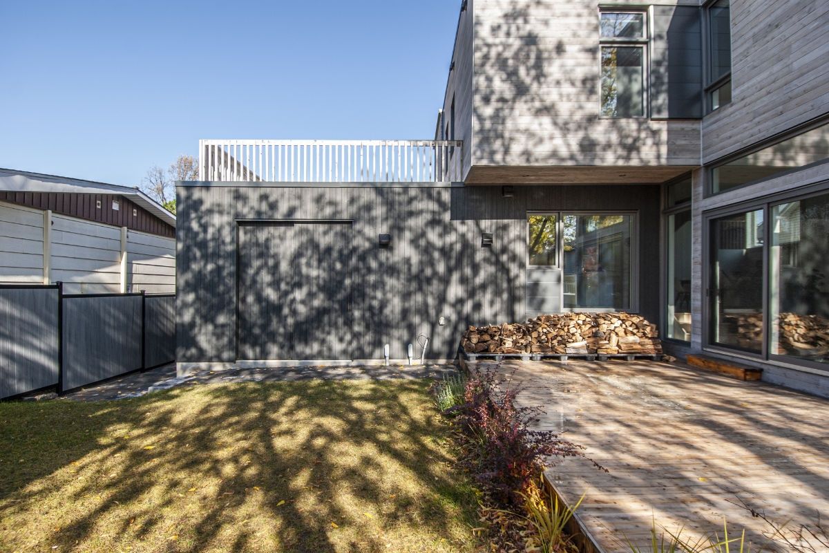 Dans son ensemble, l’habitation a été réfléchie pour pouvoir évoluer à travers le temps et présente une belle flexibilité. Le plan du sous-sol a été conçu de manière à pouvoir permettre, dans le futur, l’intégration d’un logement accessoire. Au 2e étage, la chambre à coucher donnant accès à la toiture-terrasse peut se transformer en espace commun de type bureau partagé ou petit salon pour faciliter la transition vers l’extérieur. Enfin, le garage, suffisamment spacieux pour accueillir deux véhicules, peut être réaménagé de manière à permettre l’intégration d’une zone atelier.
