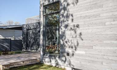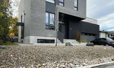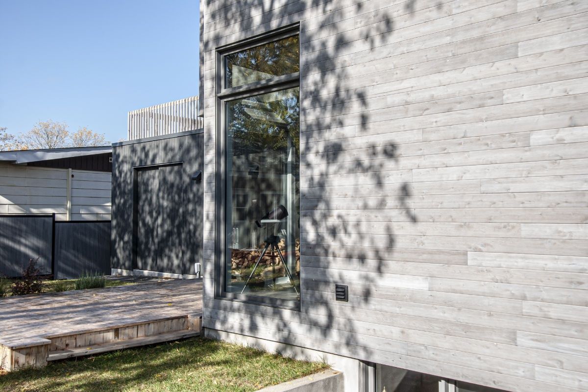La résidence du Lac des Fées est une habitation unifamilialee située dans la région de l’Outaouais. Le bâtiment est implanté dans un quartier de type banlieue. Le concept architectural consiste en une imbrication de deux volumes dont l’agencement particulier a plusieurs qualités. Du côté avant, le jeu volumétrique permet de réduire la masse du bâtiment et de mieux s’intégrer au contexte bâti environnant. La présence d’un porte-à-faux, résultant du décalage des volumes, permet également de créer une entrée couverte et invitante. Du côté arrière, la présence d’un autre porte-à-faux a pour objectif d’atténuer l’ensoleillement direct dans la cuisine. Ces différents gestes sont amplifiés par l’utilisation d’une matérialité contrastante pour chacun des volumes. La portion principale de la maison est recouverte de revêtements aux teintes claires constituées de briques de béton et de cèdre de l’est. La portion annexe, qui comprend le garage ainsi que les locaux techniques, est revêtue de bois aux teintes beaucoup plus foncées.