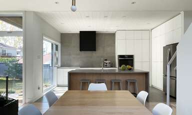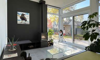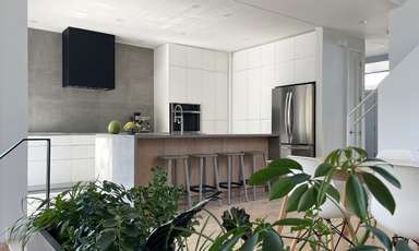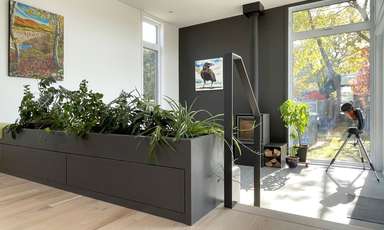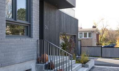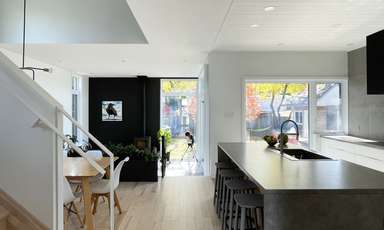 À l’intérieur, l’aménagement des espaces a été réfléchi pour optimiser l’entrée de lumière naturelle tout en assurant un certain niveau d’intimité par rapport aux voisins. Dans cet optique, un espace en double hauteur lumineux a été créé au centre de l’habitation. Celui-ci, situé au-dessus de la salle-à-manger, comprend des ouvertures en hauteur qui offrent des vues vers le ciel à partir du rez-de-chaussée. Sur cet étage, l’aire de plancher est également divisée sur deux paliers afin de rapprocher le séjour du niveau de la cour arrière. Cette configuration a pour avantage d’améliorer la connexion entre l’intérieur et les espaces extérieurs.