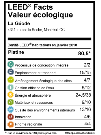 La Géode, un complexe de 5 unités résidentielles, a été pensée selon un concept de durabilité sobre, bien ficelé de A à Z et impeccable en bout de ligne. « La construction vise des standards environnementaux élevés qui en sont les prémisses: le tri et le recyclage des matériaux, la plantation d’arbres et de plantes grimpantes, l’installation d’une toiture blanche et de bacs de plantation, l’utilisation de matériaux et d’équipements efficients énergétiquement», explique Jean-Philippe Grenier, Conseiller en urbanisme, chez KnightsBridge - Construction durable. La meilleure priorisation possible des critères environnementaux a été appliquée.