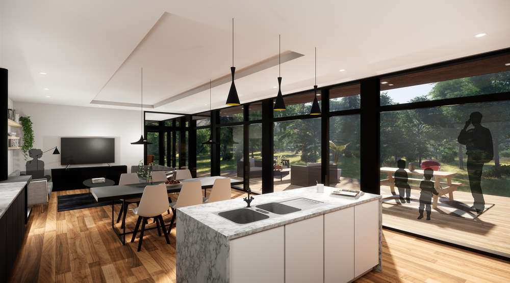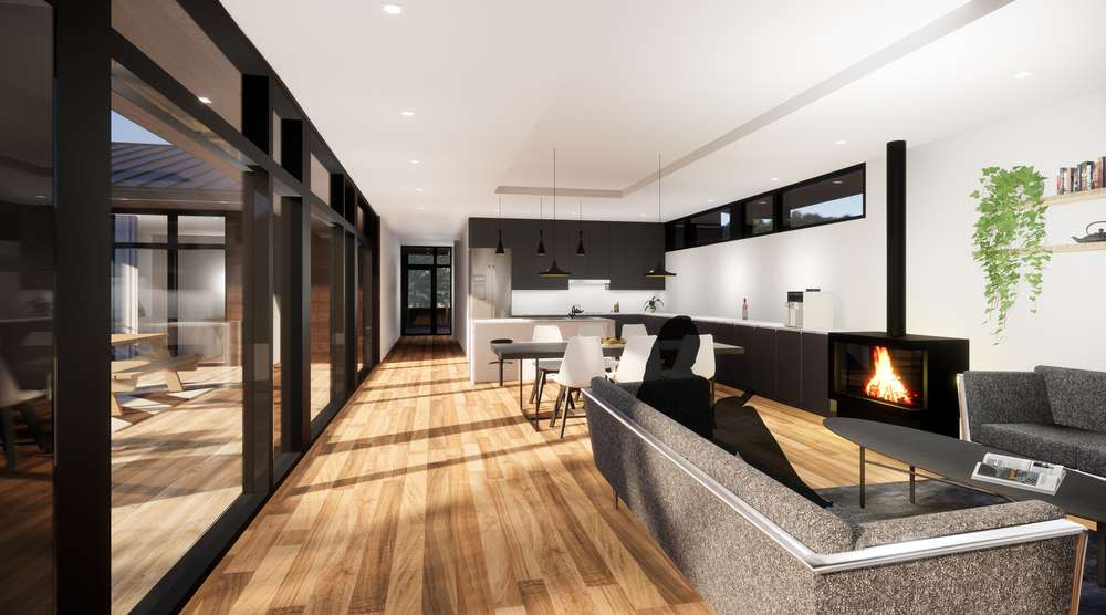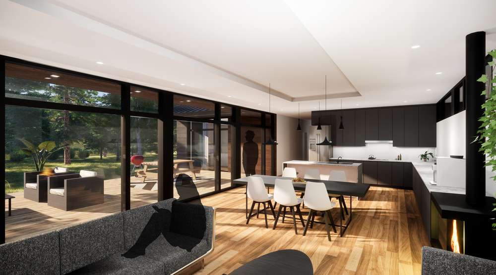Maison de campagne à plusieurs variantes, l'Abri 1850-BV met la cour au cœur de l'aménagement. Une terrasse intime à l'abri des vents et de la vue est enveloppée par la chambre principale et par une aire de vie généreuse et ouverte au parcours du soleil.