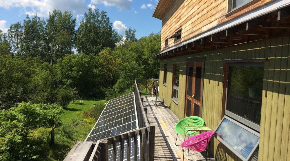 Son système de panneaux solaires est raccordé au réseau d'Hydro Québec, ce qui permet d'accumuler une banque de kWh l'été à utiliser en hiver quand le système en produit moins. Selon les habitudes de consommation de l'habitant, il est possible d'arriver à une consommation net zéro sur l'année.