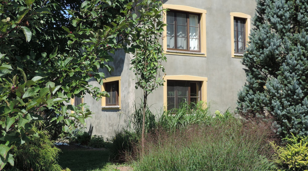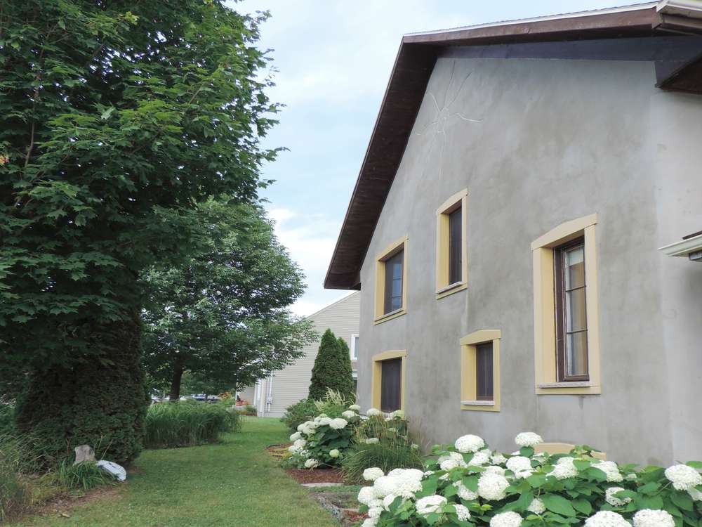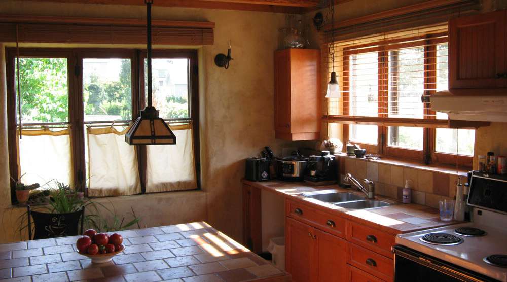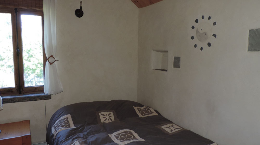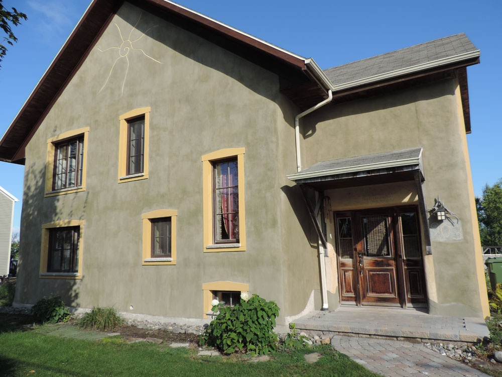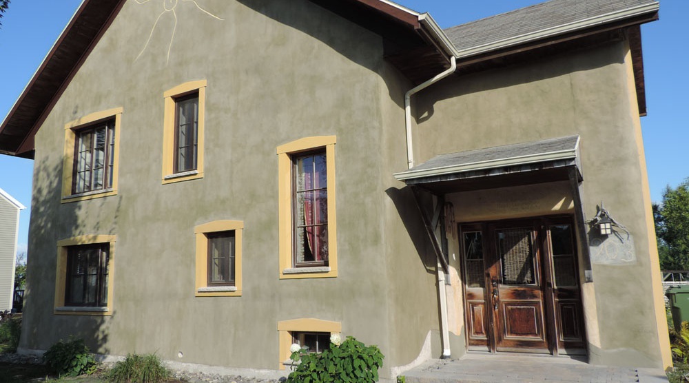 - Murs massifs isolés en ballots de pailles, recouverts d’un crépi d’argile et d’enduits à la chaux. Les murs ont une épaisseur de 16 po. Une couche de 2 po. de crépi d’argile à l’intérieur et extérieur recouvre hermétiquement la paille. Une dernière couche en enduit à la chaux vient recouvrir l’argile.
