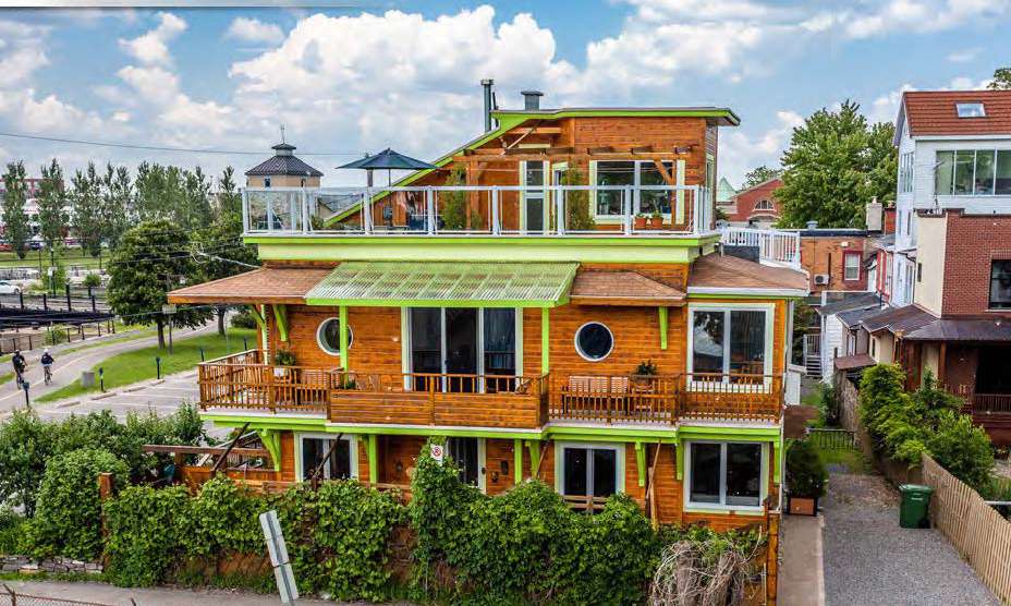 Idéalement située à l’entrée du parc René Lévesque (arboretum et jardin de sculptures), cette maison au design unique offre une superficie habitable sur 4 étages de (3,000 pieds carrés) avec un atelier, 3 chambres, une aire ouverte avec foyer central dans une pièce de 1,000 pieds carrés au niveau étage ouvert sur la cuisine complètement rénovée et un toit jardin aménagé avec cuisinette.